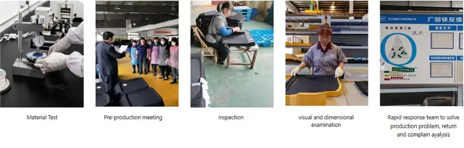 У потпуности смо усклађени са ИСО9001 за дизајн и производњу тепиха за аутомобиле, ИСО/ТСИ16949 за контролу квалитета, ИСО14001:2015 за управљање животном средином, БСЦИ за друштвену одговорност и ЕУ РЕАЦХ стандардима за сировине. Имамо интерна постројења за тестирање за обављање самопровера како бисмо били сигурни да наши производи пролазе тестове које обавља СГС, Интертек или било који други инспектор треће стране који клијенти могу да захтевају.