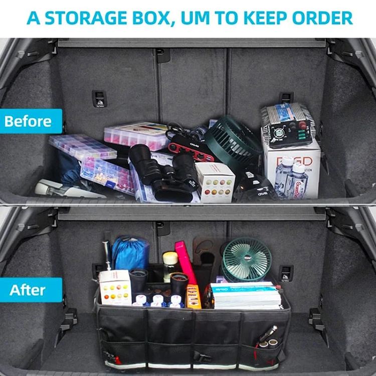 Три главна одељка садрже алате, храну, спортску опрему, средства за чишћење и предмете за хитне случајеве. Четири мрежаста бочна џепа држе мале ствари попут пешкира или картица. Џеп са предњим поклопцем обезбеђује све шансе. Одговара камионима, лимузинама, теренцима, комбијима и скоро сваком возилу.