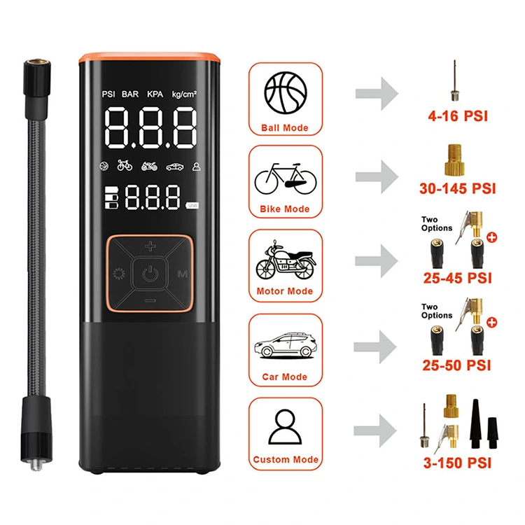 Јединице притиска: ПСИ, КПА, БАР, КГ/ЦМ² и четири унапред подешена режима надувавања. Можете подесити притисак у четири унапред подешена режима у складу са вашим возилом. Ова ваздушна пумпа је погодна за: